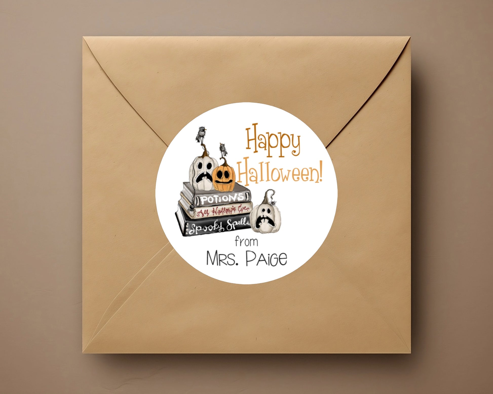 Pumpkin Books Scary Spooky Spells Crows Potion Halloween Library Teacher Student Sticker Label Happy Halloween Gift Tag Round Candy Sticker