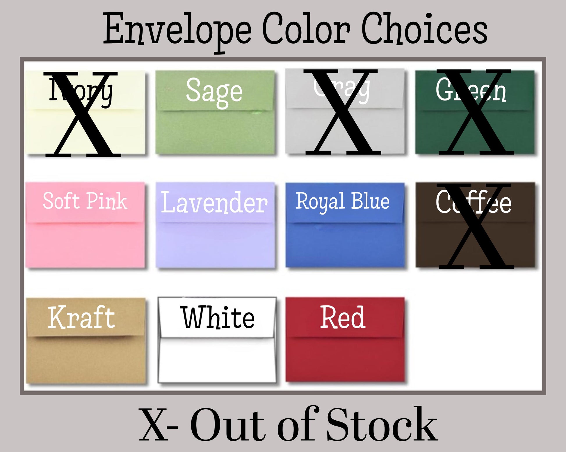 Sold in Sets of 12. Each note card includes a White or Kraft Paper Self Sealing Adhesive Envelope.